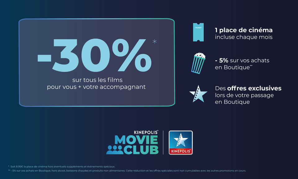 * Le Movie Club est proposé et valable dans 13 Kinepolis : Kinepolis Lomme, Kinepolis St-Julien-lès-Metz, Kinepolis Amphithéâtre, Kinepolis Waves, Kinepolis Amnéville, Kinepolis Thionville, Kinepolis Mulhouse, Kinepolis Nancy, Kinepolis Nîmes, Kinepolis Brétigny-sur-Orge, Kinepolis Belfort Kinepolis Fenouillet et Kinepolis Rouen.