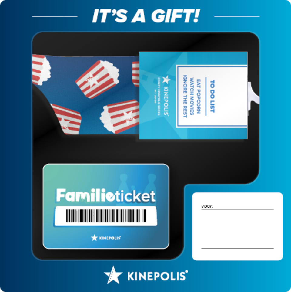 Met de Kinepolis Giftbox geef je iemand een stijlvol filmuitje cadeau. Deze unieke box bevat een paar warme sokken en kan gecombineerd worden met een filmvoucher voor een film naar keuze, een Sterrenticket of een Familieticket. Het is de ideale manier om iemand te verrassen met een uitje naar de bioscoop en ook nog eens super leuk verpakt!